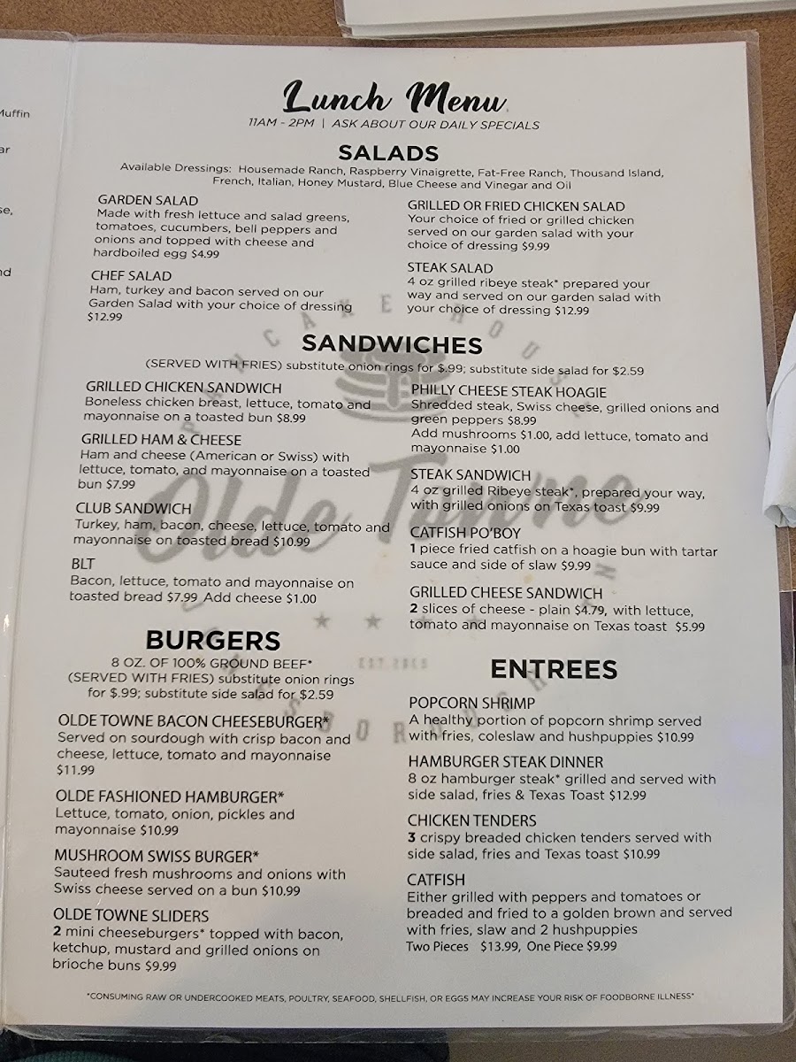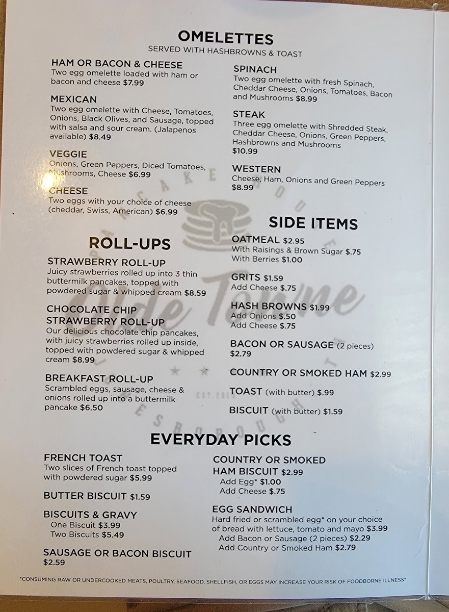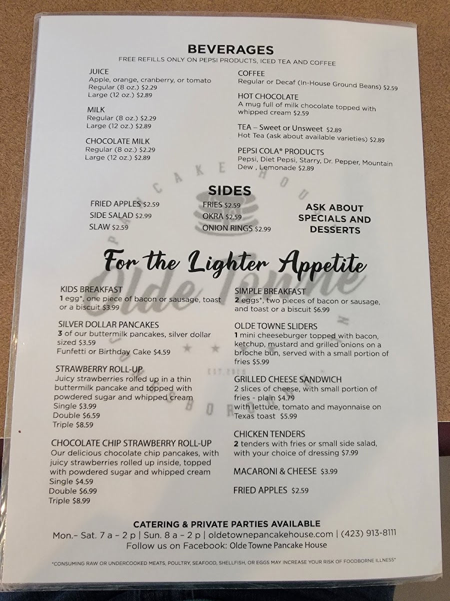 Welcome to Olde Towne Pancake House and Catering, a cherished gem located at 142 Boone St, Jonesborough, TN. This inviting establishment shines with a warm, family-friendly atmosphere that makes breakfast a delightful affair. Renowned for its gigantic, fluffy pancakes, the menu also boasts expertly crafted omelets and traditional breakfast combos that are sure to satisfy any craving.